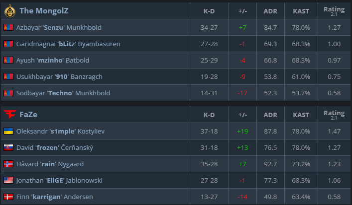 在他们的决胜局比赛中蒙古Z,'s1mple'是得分榜上排名第一的人,这表明他带着令人难以置信的表现回来了,并且他已经准备好为球队奉献自己的一切。除了他之外,是整个团队一起努力,'雨','埃利格'和“冻结”看起来状态很好,疯狂地战斗,同时一直被他们的游戏领袖炒作'椅子',他是现场留下的最有经验的游戏领导者之一。他们的优势在于大舞台的经验,而且他们以在大舞台上表现得更好而闻名。