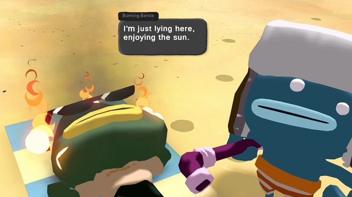 诚然,考虑到所有因素,这是一个相当短的嬉戏。你会有大量的支线任务,比如检查燃烧的伯尼(他一直在阳光下做饭,以至于他真的着火了)、做瑜伽小游戏,或者和孩子们一起踢柑橘足球。绕岛一圈并不需要超过几分钟,但环境的多样性足以让这座小岛城市的表现更好。就这么简单,虽然不知道能不能说是超级密密麻麻的。你可以找到金钱、涡轮垃圾、蘑菇编钟和软糖小狗蓝图,诚然,这就是城镇周围发生的大部分事情。对于那些喜欢带有 GTA 疯狂风格的小型收集马拉松的人来说,这是一款非常流畅、小巧、舒适的游戏。我对一切都如此完美地浓缩成一种体验印象深刻,而且在第一个小时内并没有失去它的受欢迎程度。用扳手敲打一个四肢无力的行人,在游戏开始 5 小时和在游戏开始 10 分钟时一样有趣。由于基本上没有死亡能力(甚至在卡住时还有重置按钮),所以在引起恶作剧或看看你是否能以某种方式破坏游戏时,没有太多可担心的。如果你偷(和卖)汽车,警察警戒级别不会上升,不会造成坠落伤害,没有饥饿计,如果你把车浸入水中太深,也只会收取少量费用。它让笑声不断,不会干扰您的整体体验,当您添加非常迷人、有趣且轻松的配乐时,您会获得很多积极的氛围,从而帮助《Tiny Terry's Turbo Trip》成为一款梦幻般的舒适游戏。