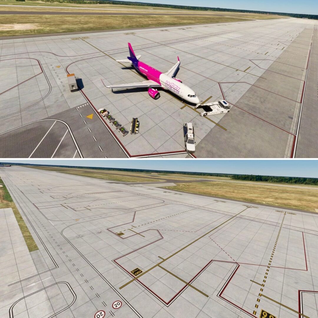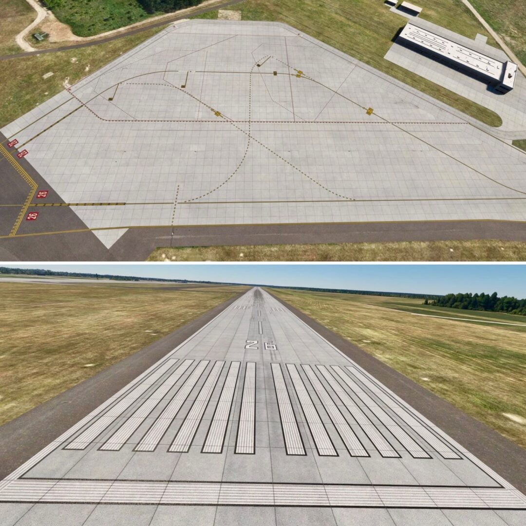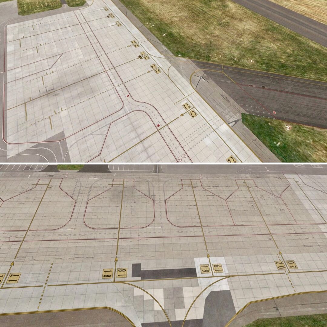 在地面方面,完整的布局已接近完成。边缘标记、混凝土接缝、轮胎防滑放置和围裙污垢层已完成。地面线路已导出、完善并在空侧对齐。
