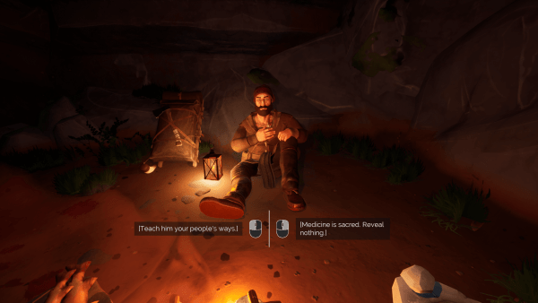 这很大程度上是一个行走模拟器。你将珍妮和迈坎推进到他们的下一个叙事目标,偶尔做出对话选择或检查一个项目。没有战斗或失败状态;唯一影响你的故事的是你所做的决定。我很欣赏这一点,并发现看到我选择做的事情如何影响珍妮的信仰或迈坎对其他人的信任很有趣。还有一本方便的手抄本,描述了两人在旅途中遇到的某些单词和物品。我喜欢这个实现,它进一步让你投入到游戏中。