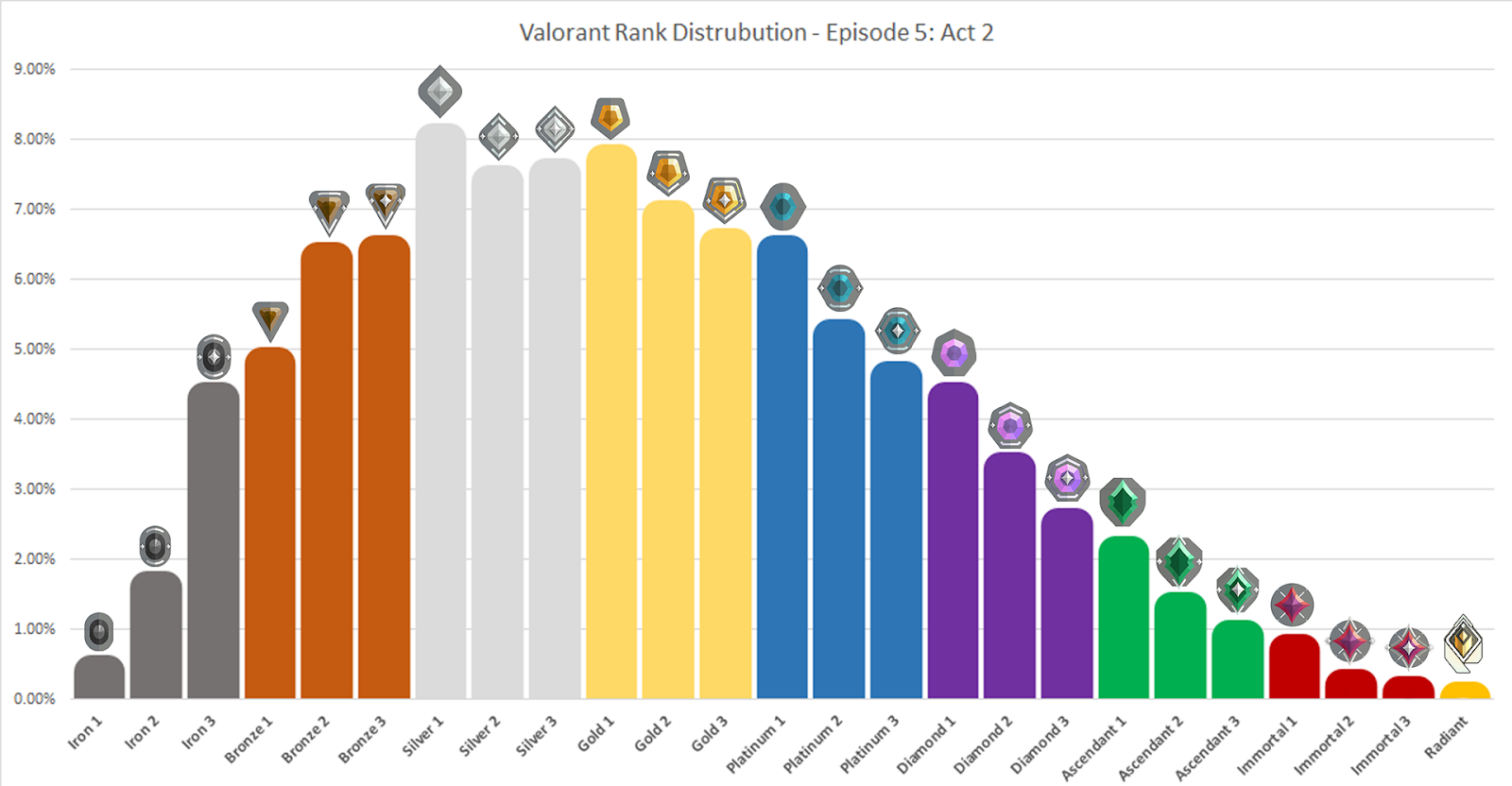 瓦兰特的结构化层系统从入门级铁层开始,并升至精英辐射等级。除辐射外,每个层都分为三个子级。简而言之,排名系统包括: