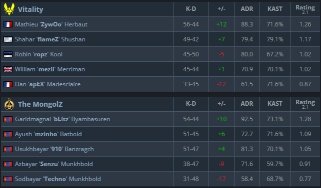 他们的状态一如既往,势不可挡,就像他们连续五场比赛获胜一样。'ZywOo'和'罗普兹'在他们的记分牌上名列前茅半决赛匹配莫兹,对于任何必须与他们比赛的球队来说,拥有两名处于如此令人难以置信的状态的球队明星球员已经是一个坏兆头。其余的活力球员们也处于良好的状态,并准备好在需要时拿出他们的最佳表现。