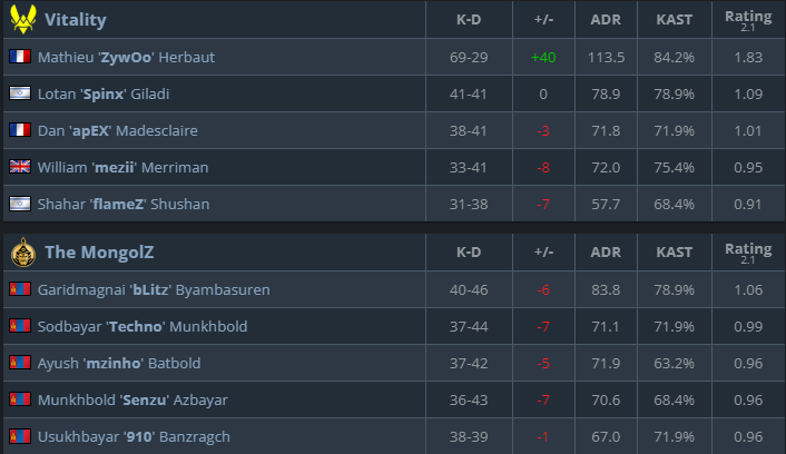 让我们从他们的明星球员开始'ZywOo';他在他们玩的大部分地图上都领先记分牌,而且他的状态令人难以置信。'火焰Z'是第二颗星以及之后的第二颗星'ZywOo'统计上。'罗普兹'正在适应他的新球队,但已经表现得很好。总体而言,他们似乎已经做好了争夺这座奖杯的准备。