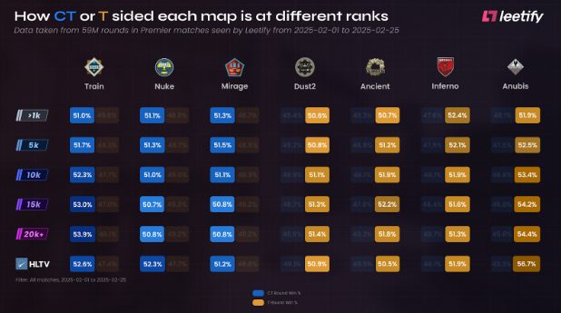 在 Matchmaking Premier 中,CT 侧的地图往往在更高级别时更倾向于 CT 侧。例如,Train 和 Nuke 在高排名比赛中(20K+ Elo)的 CT 胜率达到近 54%。这表明,对于排名较低的玩家来说,防守设置更容易执行,他们可能会在 T 方的协调进攻中遇到困难。