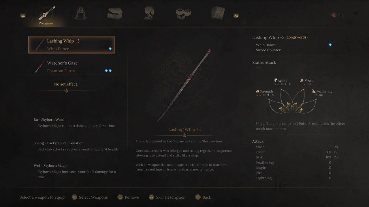 你解锁的天赋与你的法术、生命值补充和选择的武器类型有关。我几乎只使用长剑,因此专注于它们,解锁了赋予我特殊能力的学科,但代价是一种名为“Skyborn Might”的可充电资源。这本质上是法力(尽管在武昌,甘露是代表 Estus 的饮料),是你施展法术、激活戒律攻击和武器专用艺术的资源池。在这里,《武昌:落羽》擅长为你提供选择,从在两种武器之间切换时触发的特殊招架和吸引攻击,到毁灭性的法术和增益,或炸弹和匕首等可投掷物品。