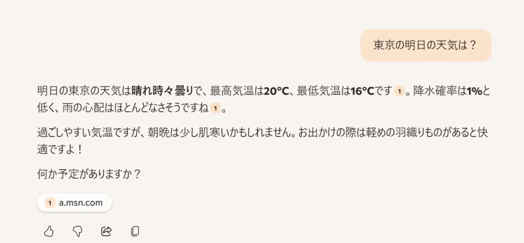 Copilot 与 Bing 搜索引擎集成,因此您可以访问互联网上的最新信息并提供信息来回答您的问题。例如,它会根据最新信息回答“东京明天的天气怎么样?”或“告诉我人工智能技术的最新趋势”等问题。