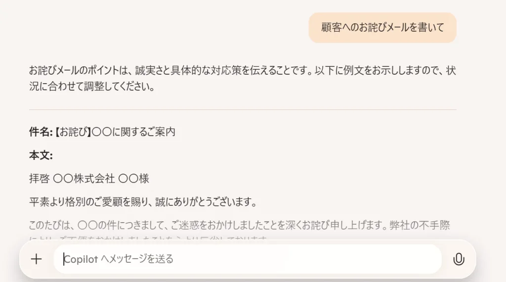 Copilot 最基本、最强大的功能是文本生成和编辑帮助。起草电子邮件、撰写报告、集思广益、总结文本等等。支持各种文本相关任务我会。例如,如果您只是指示应用程序“向客户写一封道歉电子邮件”,它会建议一封看起来专业的电子邮件。