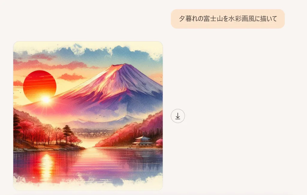 令人惊讶的是,它鲜为人知,但即使使用 Copilot 的免费计划,您也可以使用 DALL-E 3 的图像生成功能。如果您给它一个指令,例如“以水彩风格绘制日落时的富士山”,它就会生成符合您要求的图像。然而,您必须使用 Microsoft 帐户登录才能生成图像。