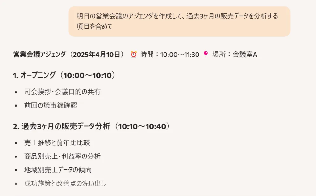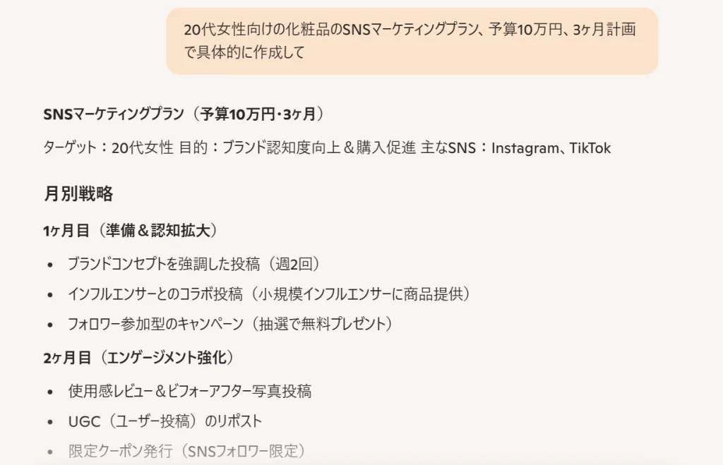 例如,不要简单地说“制定营销计划”,制定针对20多岁女性化妆品的具体SNS营销计划,预算为10万日元,为期3个月。”你会得到一个更有用的答案。