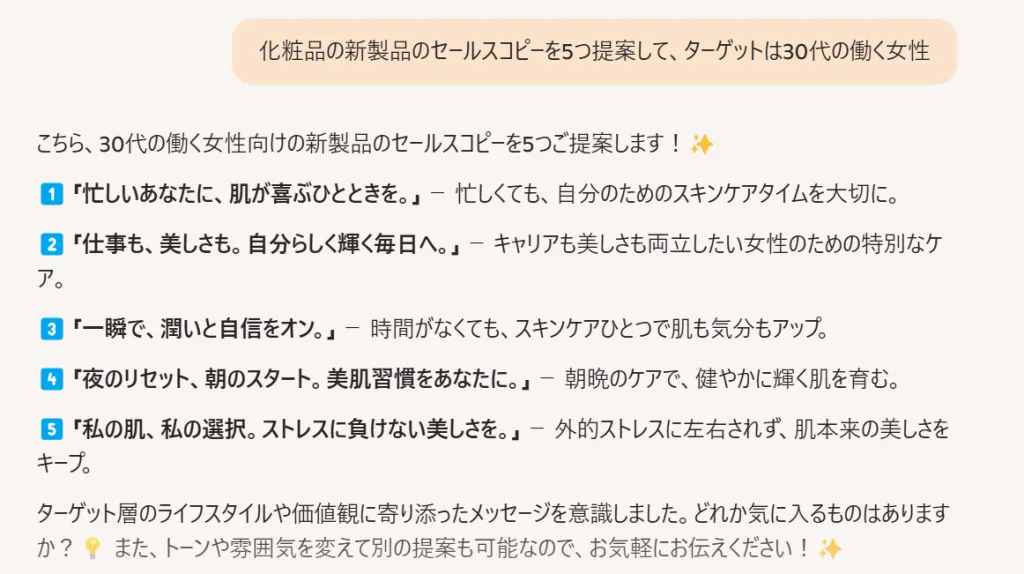 在创建营销材料时,Copilot 也是一个强大的盟友。例如,您可以使用提示“建议 5 个针对 30 多岁职业女性的新化妆品销售文案”来立即获得一些想法。