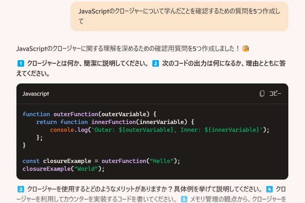此外,它还可以用来复习你所学的内容并检查你的理解情况。如果您说“创建五个问题来回顾您所学到的有关 JavaScript 闭包的知识”,它将为您生成自测问题。这些学习支持功能也是 Copilot 功能的一个重要方面。