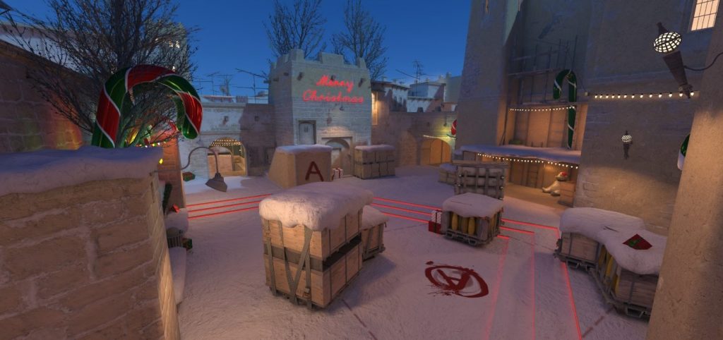 de_Mirage 聖誕版 | WINGMAN 是粉絲製作的 Mirage 聖誕節重新皮膚,專為 CS2 中的 2v2 Wingman 打造。在熟悉的幻影建築之上呈現聖誕節視覺效果:雪、裝飾品、聖誕老人道具等。