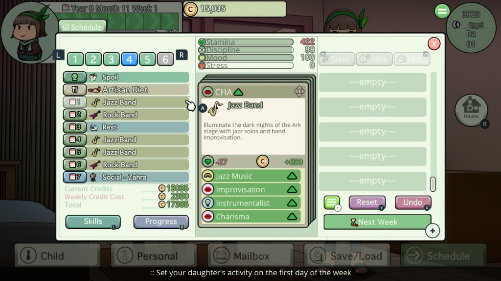 那麼,如果你嚴格意義上不是父母,你又是什麼?監工,就是這樣。作為一款模擬遊戲,Ciel Fledge 圍繞玩家委派每週的日程安排展開。通常,這意味著讓她參加課程或工作——因為提高夏爾的統計數據是遊戲中最重要的方面之一——但你也可以做一些事情,比如帶夏爾購物、全家度假,或者強迫你的女兒探索方舟下方怪物出沒的地球。你知道,這只是普通的父母的事情。