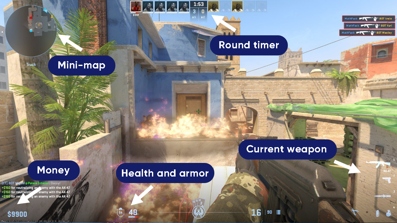 兩支隊伍——恐怖分子(T)和反恐分子(CT)——在短回合內戰鬥。雙方都有自己的目標: