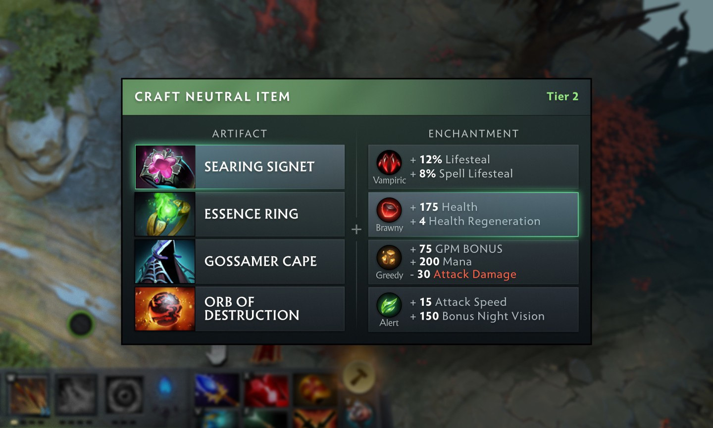 Valve 徹底改變了中性物品掉落的機制。現在,玩家不再隨機掉落,而是獲得用於殺死中立小兵的石頭——兩塊石頭用於普通小兵,三塊石頭用於遠古小兵。這些石頭會不斷積累,一旦收集到足夠的石頭,玩家就可以在兩個物品之間進行選擇。