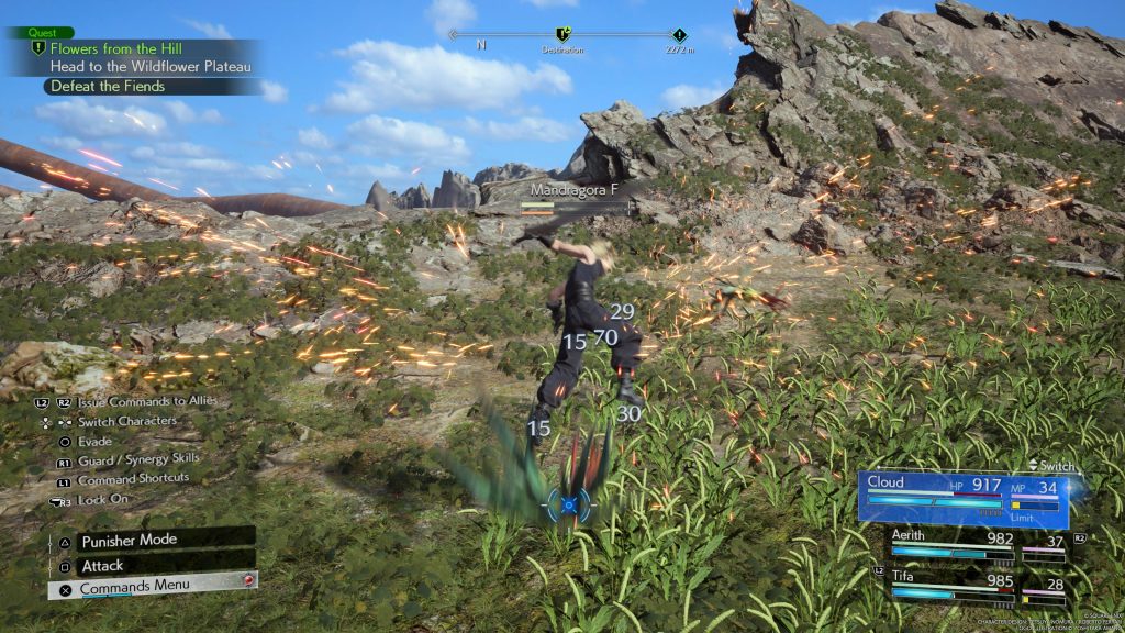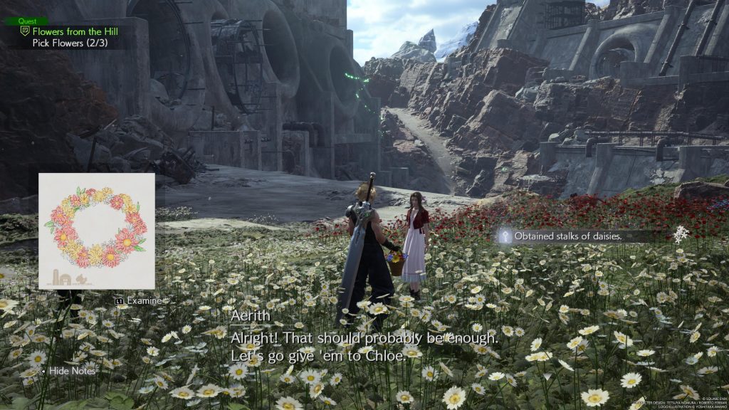 到達野花高原的花壇後,你會遇到一群憤怒的曼陀羅。只要你的等級適當,你應該能夠在短時間內解決它們。擊敗最後一個曼陀羅後,前往艾麗絲,她會給你一個花籃,並幫助你收集鮮花,就像《最終幻想 7 重製版》中的葉屋鮮花任務一樣。