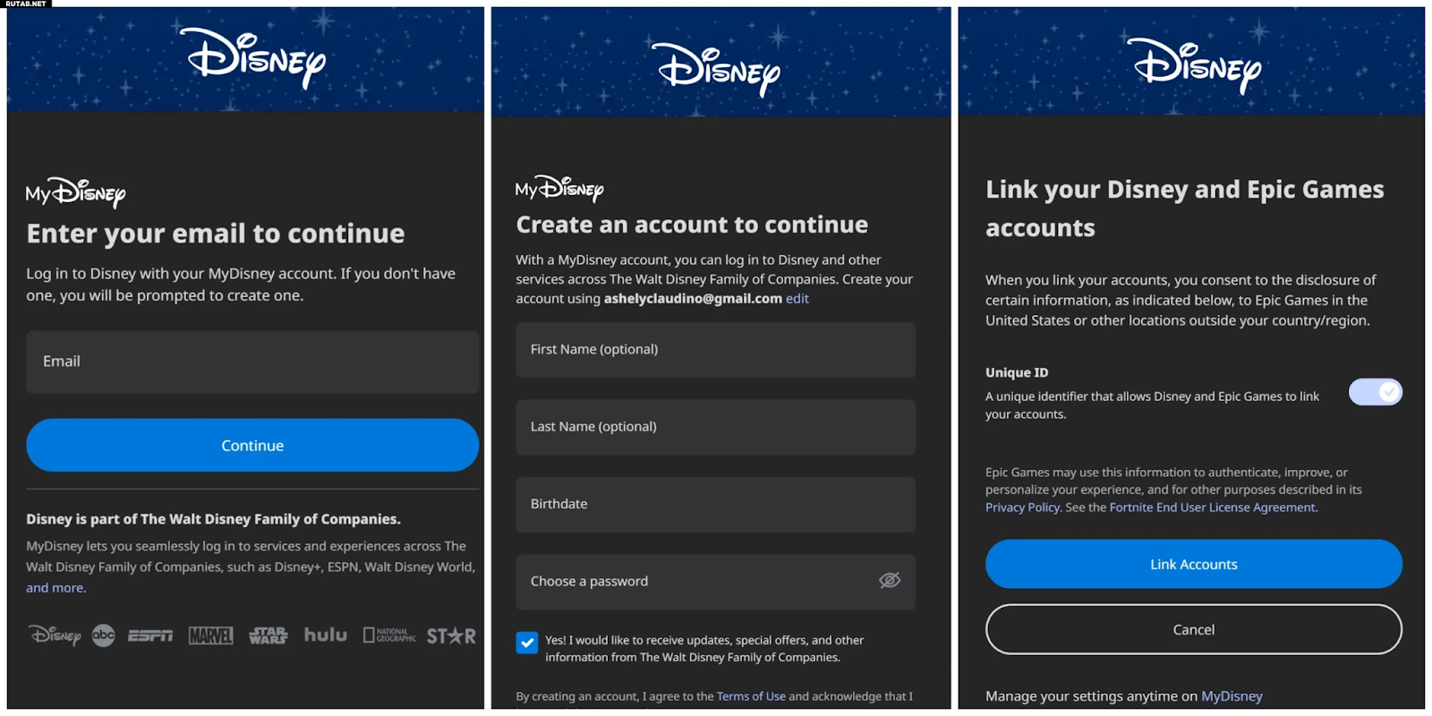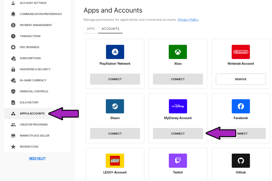 - 按照說明登錄並連接您的您的 Epic Games 的 MyDisney 帳戶帳戶。單擊“關聯賬戶”按鈕鏈接兩個帳戶。