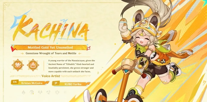 卡奇納(Kachina)是迴聲之子的代表,將成為納特蘭的第一位四星,同時也是一名地理長柄武器使用者。現在,卡奇娜還帶著她騎著的小鑽孔裝置,看起來就像是世界上最危險的陀螺。這個所謂的渦輪旋轉不僅可以通過將其撞擊到地面來幫助她造成 AoE 地理傷害,而且還可以用來幫助她穿越陡峭的懸崖面。不再擔心體力,只需開車上牆即可!渦輪旋轉也可以留在場上造成周期性的 AoE 地理傷害,並通過她的元素爆發產生的大範圍獲得一些增益。