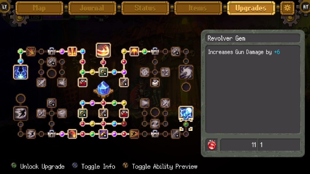 遊戲中最簡潔的部分之一是 Aletheia 的升級樹。在那裡,您可以花費AP(能力點)來激活新節點。這些可以做一些事情,比如提高她的生命值或增加她的武器的傷害輸出。第一次使用任何保存點(稱為繫繩)、升級或找到並用子彈擊碎紅色發電機時,您都會獲得 AP。您還可以通過接受並履行董事會的賞金來獲得它們,其中主要包括殺死一定數量的特定敵人。