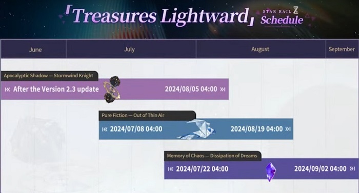 接下來是一種名為“世界末日陰影”的新永久游戲模式,愛德華博士試圖追踪一位無形的王子,他在開拓者無盡的戰鬥記憶中徘徊。該遊戲模式的每個階段都有兩個敵人,本質上是 Boss Rush 模式,有四種難度可供選擇。你將檢查你將要對抗的敵人的特徵,選擇一些增益來加入戰鬥,然後看看。首次通關末日之影的設定難度,你將有機會將雪衣加入你的隊伍,並獲得 300 塊星玉和 1 個自塑樹脂。這個新遊戲模式的第一階段將在 2.3 的更新中推出,循環更新的三種主要遊戲模式將遵循輪換時間表,如下所示。