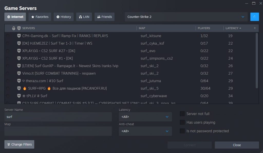 要加入社區 Surf 服務器,請進入 CS2 並播放 → 地球圖標 → 社區服務器瀏覽器。在這裡,在搜索欄中輸入“surf”。找到 ping 值最低的一個,然後單擊加入。