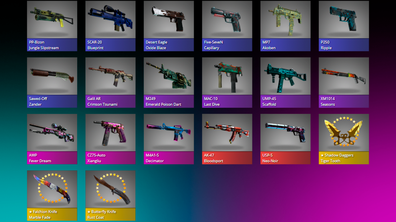 | 隱蔽 | 紅色的 | 超稀有(例如 AK、AWP) |