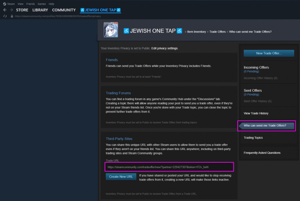 點擊“誰可以向我發送貿易報價?”在這裡,您將找到您的個人交易 URL。您可以復制此鏈接以進行共享或粘貼其他人的鏈接以開始交易。