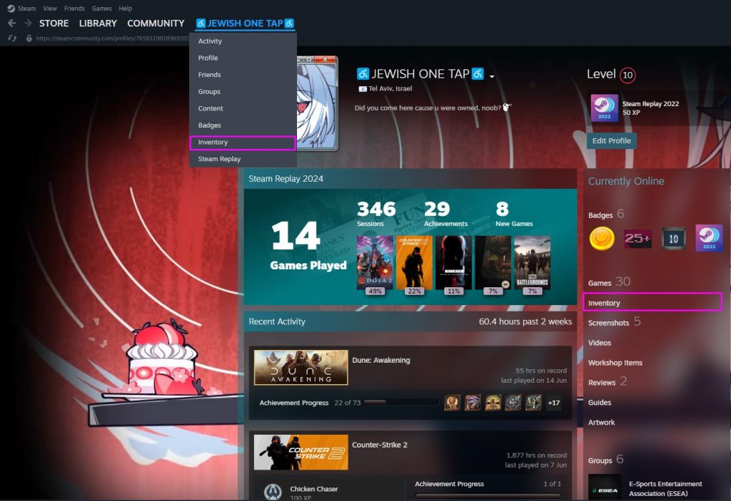 在您的個人資料頁面上,單擊“存貨”選項卡。這會顯示您的所有 CS2 皮膚和其他 Steam 物品。