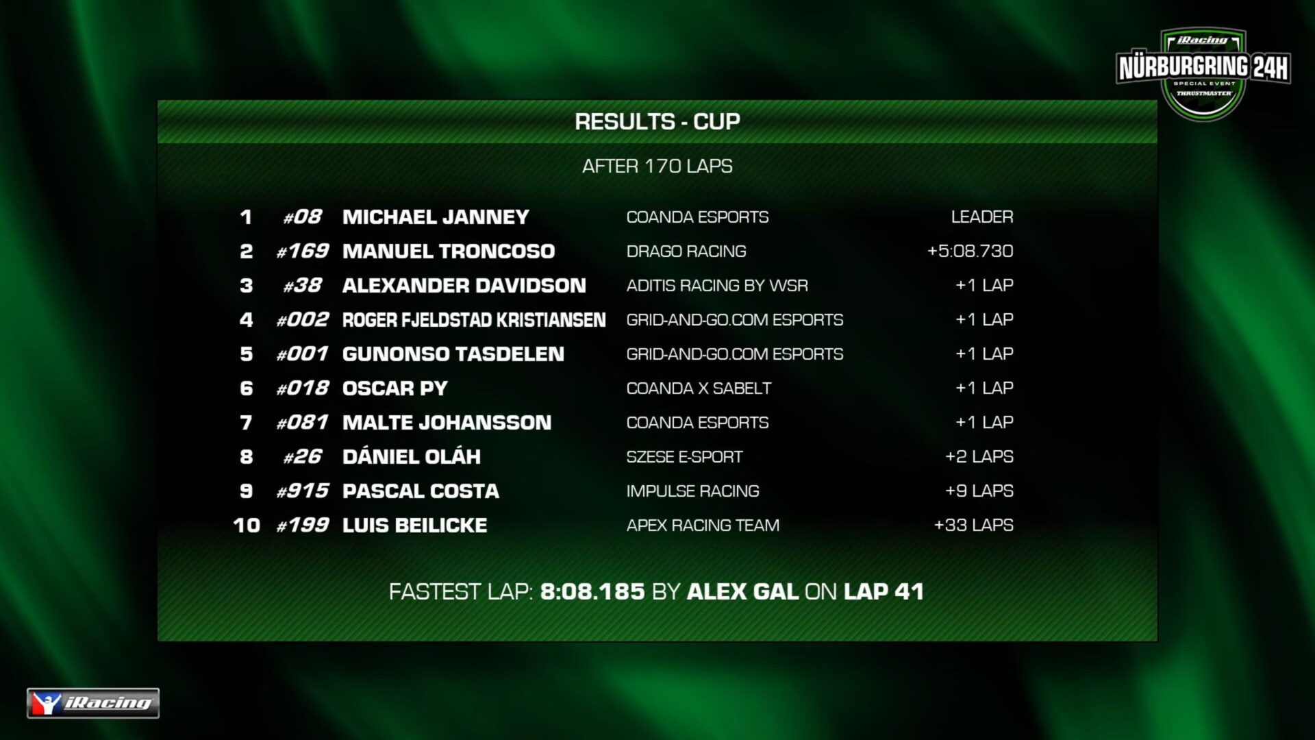杯組冠軍由 08 號 Coanda Esports 奪得,緊隨其後的是 169 號 Drago Racing。