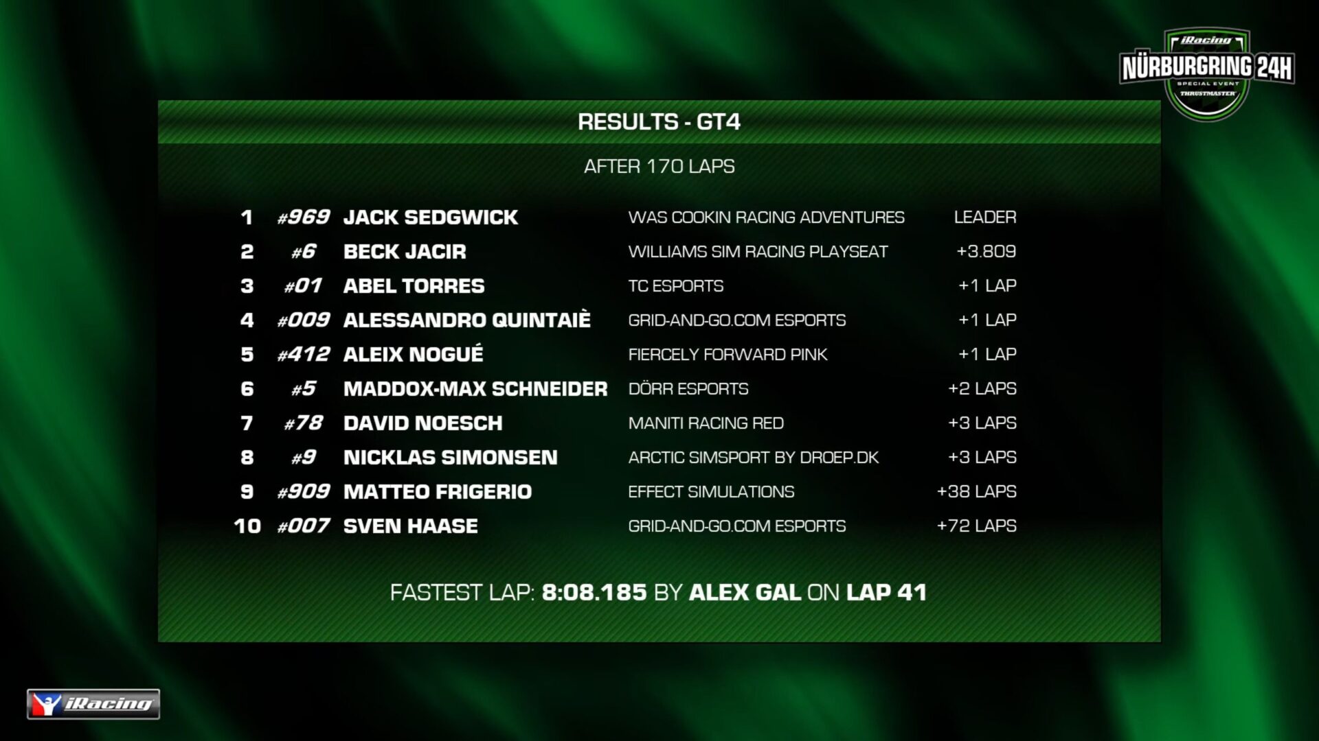 GT4 組別見證了#969 Was Cooking Racing Adventures 的勝利,#6 Williams Sim Racing Playseat 獲得第二名。