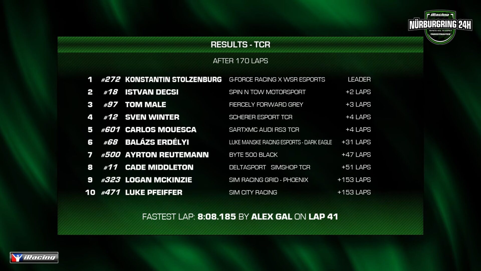 TCS 組別冠軍由#272 G-Force Racing X WSR Esports 奪得,緊隨其後的是#18 Spin N Tow Motorsports
