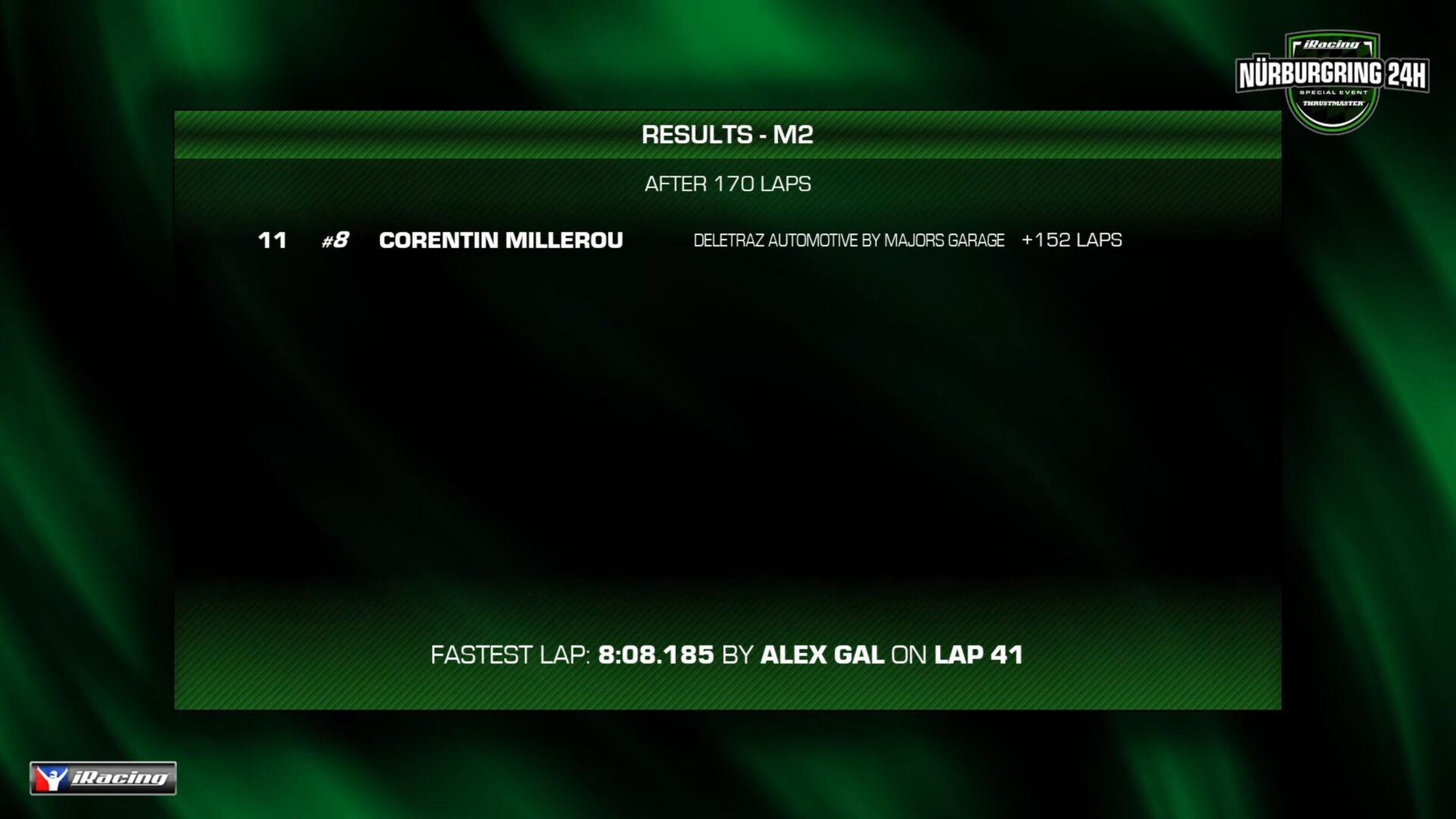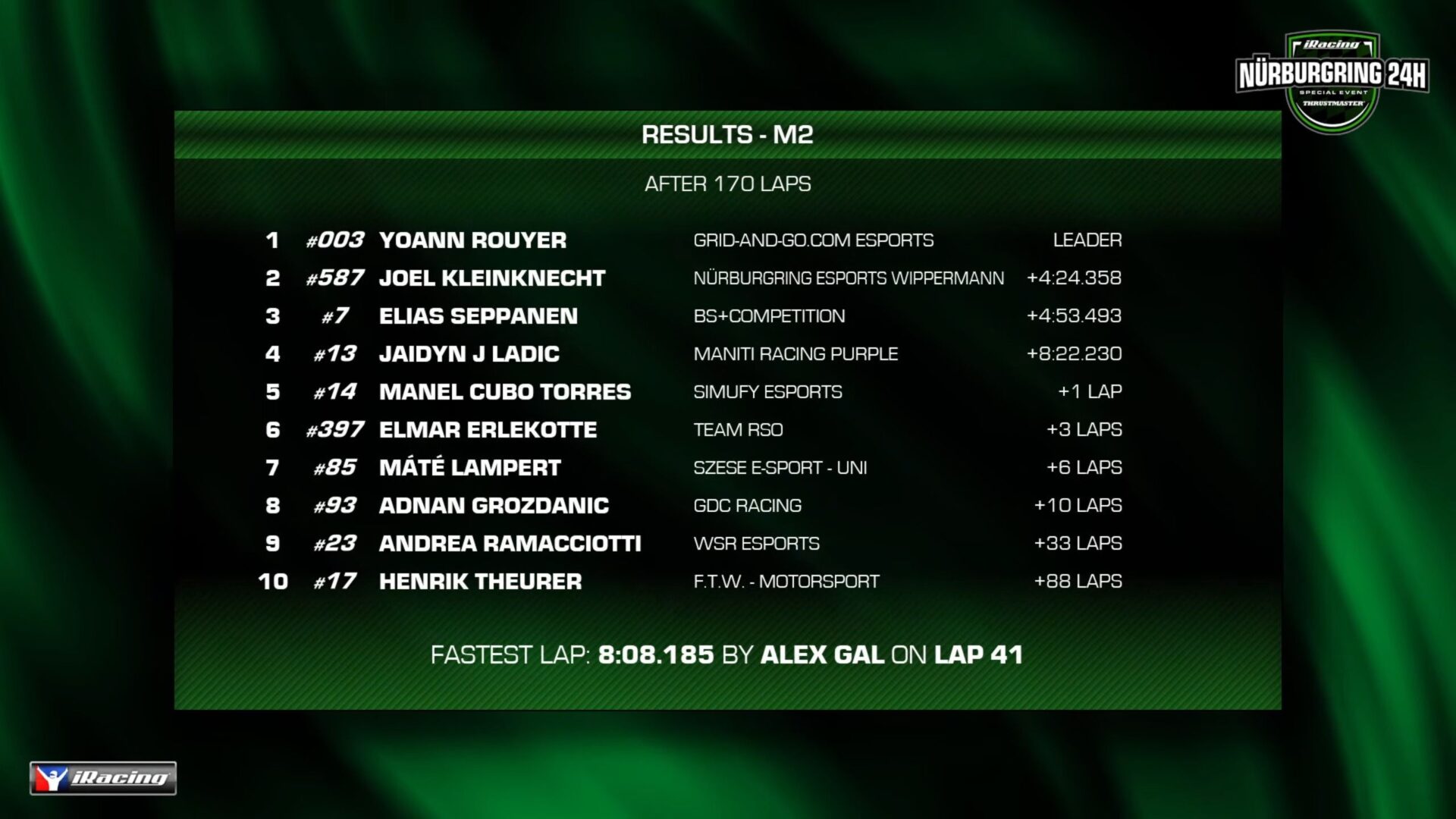 M2 組別中,#003 Grid-and-go.com Esports 獲勝,#587 Nürburgring Esports Wippermann 獲得第二名。