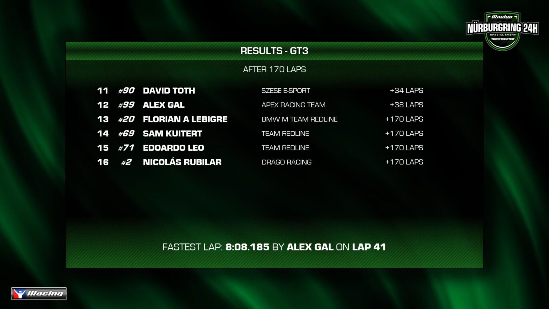 比賽分為五個級別,從頂級 GT3 級別開始,排名第 3 的 Williams Sim Racing Chillblast 車隊獲勝,排名第 1 的 Williams Gaming Club 車隊緊隨其後。
