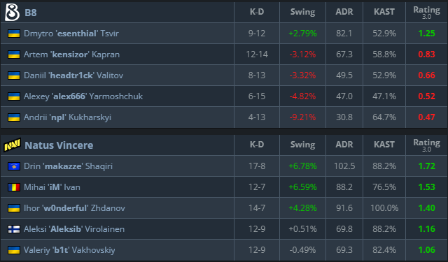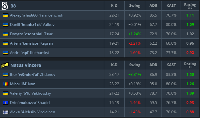 導航8-2領先,令人窒息B8試圖獲得地圖控制權。雖然B8成功拿下半場最後兩輪比賽,導航立即用第二把手槍關上了門。阿列克西·維羅萊寧在發球後完成了一次壓倒性的三殺,乾淨利落地以 5-0 結束比賽,輕鬆結束了地圖。