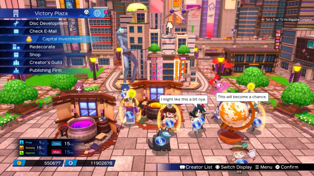 老實說,Game Maker R:Evolution 的光盤開發系統感覺就像是一個地毯拉力。從表面上看,事情很令人興奮。你有自己的可定制廣場供你的工人漫步,有很多關於遊戲設計的選項,遊戲甚至還加入了技能樹。 Gamer Maker R:Evolution 做得非常好,讓您感覺光盤開發非常重要且令人興奮。而且,值得讚揚的是,它確實有它的用途——一旦你正確地升級了所有東西,你製作的那些光盤可以給你一些很酷的技能組合。然而實際上,這款遊戲在機制方面提供的大部分內容只是《姐妹大戰姐妹》中提供的內容的稍微修飾版本。如果這是一個全新的機制,我會同意的。然而,他們沒有對以前已經很成熟的東西做更多的事情,這一事實令人失望。