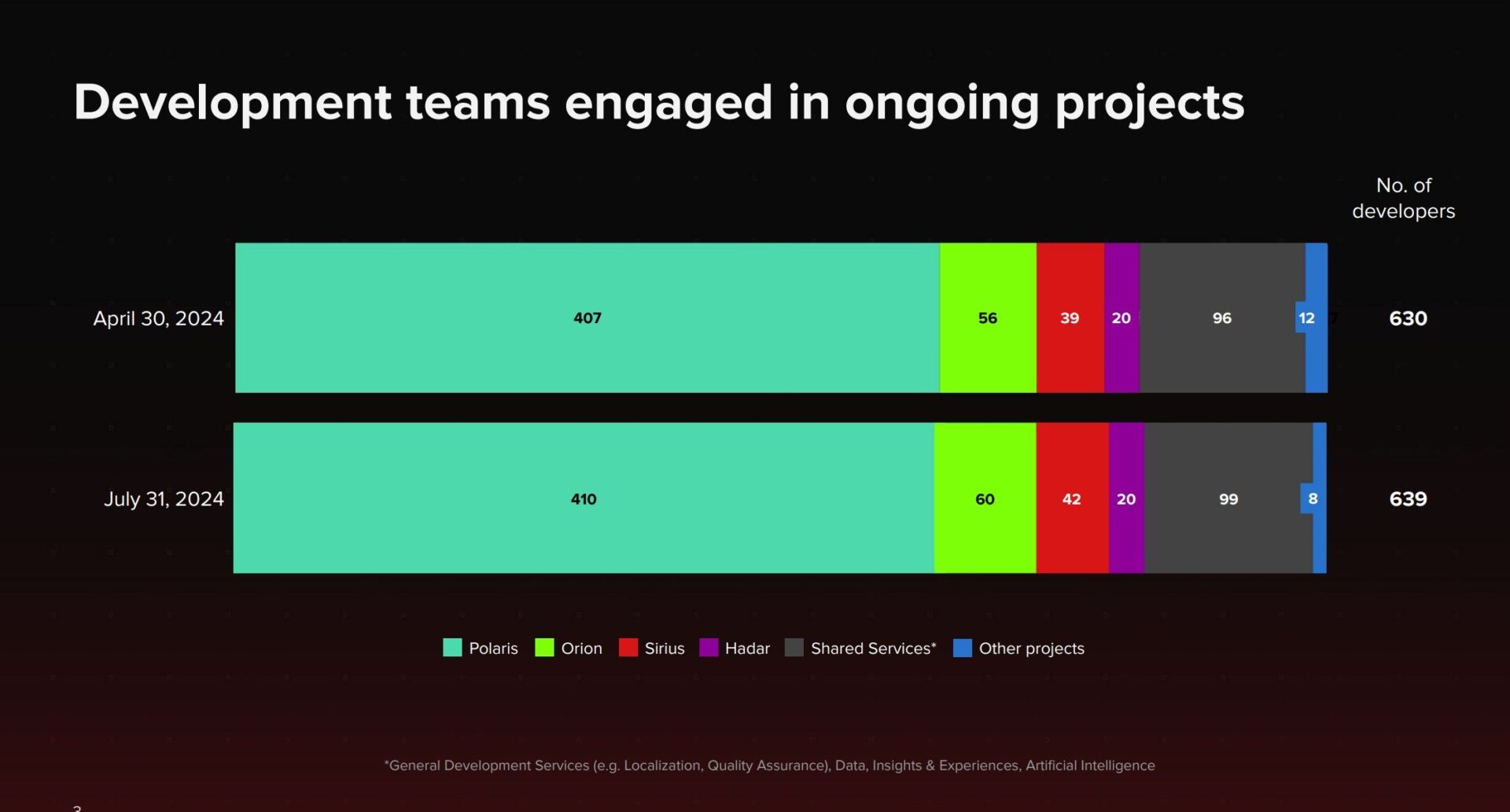 如下圖所示,截至 7 月 31 日,更新後的團隊人數為 410 名從事 Polaris 開發的開發人員,而公司更新後的總數為 639 人。