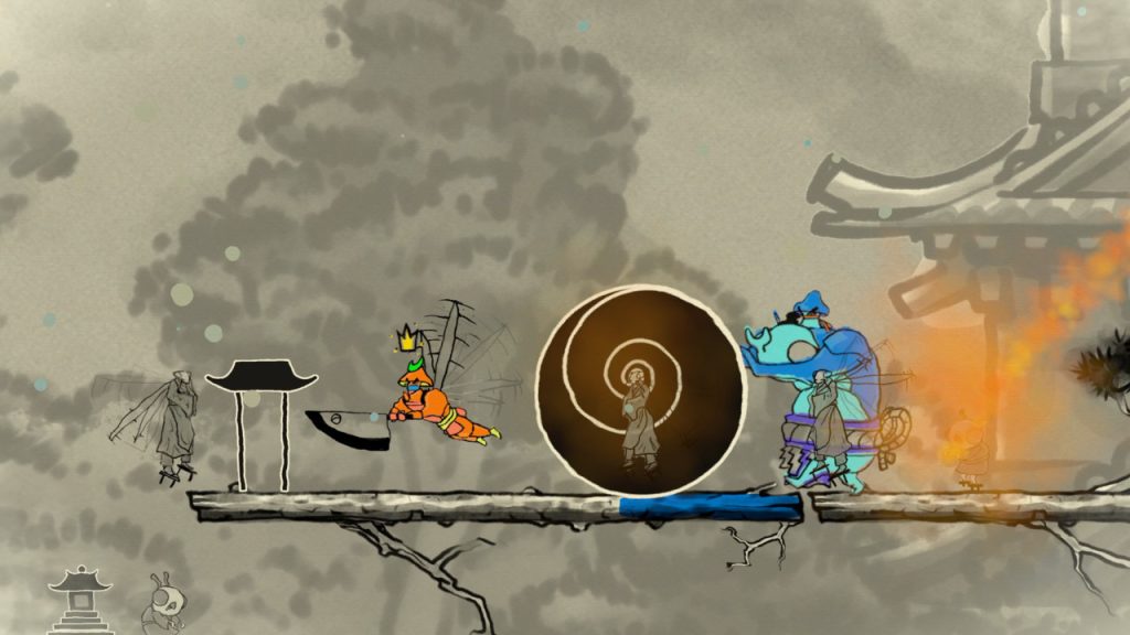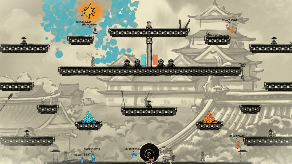 遊戲中立即引起我注意的一件事是日本水彩畫風格。儘管它只使用了幾種顏色,但它非常華麗,這是我決定嘗試該演示的一個重要原因。然後,我和藍隊與我的蘑菇同伴一起竭盡全力贏得勝利。遊戲中有 3 種不同的勝利條件。首先你可以擊敗對方的幕府將軍一定次數;或者你可以在足夠多的神社上放置球體;或者以我最喜歡的方式為例,跳上一隻巨大的糞甲蟲,將一團糞便推向勝利線。