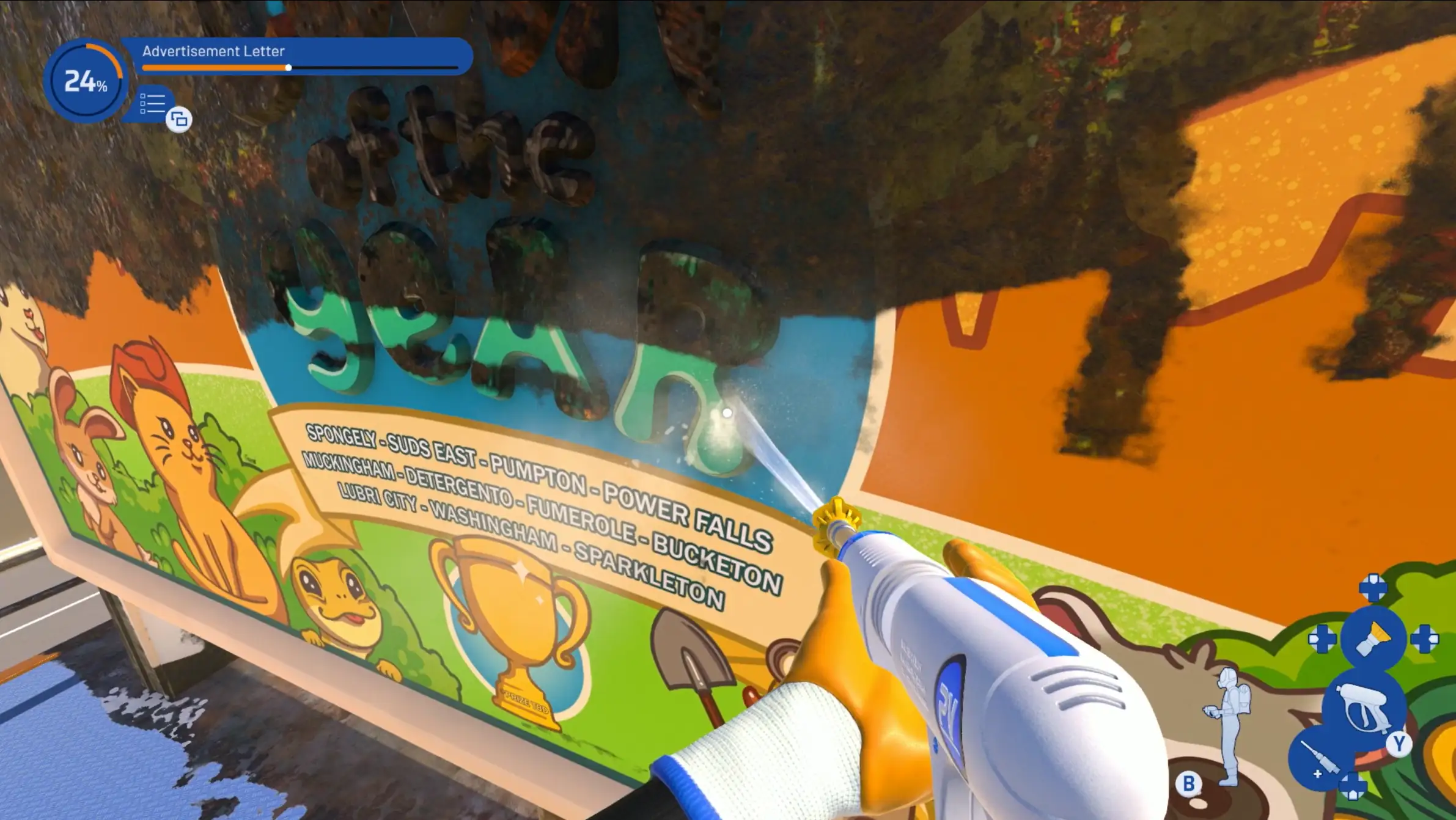 說到級別,我嘗試了三個。第一個是塵土飛揚的高速公路旁的一個骯髒的廣告牌。我徑直走向這一層,因為它包含繞繩下降設備,這使得在沒有任何腳手架的情況下更容易清理高處表面。上下座位有點挑剔,但一旦你坐上座位,你就可以或多或少完全自由地在廣告牌上上下飛翔。與前一款遊戲一樣,Futurlab 在關卡和其中的元素設計方面做得非常出色,而且這個廣告牌不僅僅是一個平面,而是有各種字母和形狀從中突出。能夠使用繩降套件到達那裡,使得清潔難以到達的區域比使用長噴嘴從遠處嘗試要容易得多。