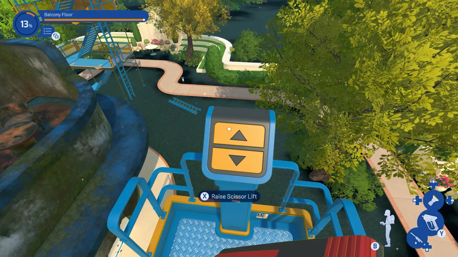 然後我去了裝飾藝術之家,嘗試新的剪刀式升降機。這個關卡是最讓我想起前一款遊戲的關卡,但是有很多角落和縫隙,清理起來非常令人滿意。剪刀式升降機可以讓你快速到達地圖的較高部分,但我發現自己出於習慣默認嘗試跑酷。我確實注意到天空中有一道飄逸的光芒在遠處兩座房屋之間呈弧形延伸,所以我預計我們將在 PowerWash Simulator 2 中看到另一個奇異的科幻故事。