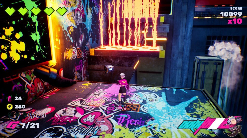 也就是說,你不只是自由地奔跑。巴夫先生的機器人部隊不斷尋找並消除威脅。因此,您還必須依賴 Valah 強大的平台技能。從一開始,瓦拉就證明了自己難以置信的機動性,她擁有近戰攻擊、跳躍和二段跳、潑漆滑動和懸停,甚至還有一個可以讓她到達遠處的抓鉤。她還能夠在鐵軌上磨削,這主要是自動的事情,但稍後會詳細介紹。我真的很喜歡瓦拉的靈活性(除了她有點重的跳躍物理和無法在格柵上滑動),而且我發現像流氓一樣到處跑很有趣。