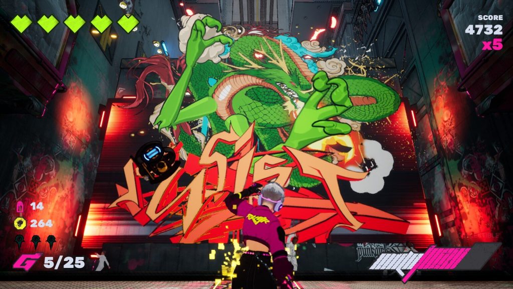 從視覺上看,Rakugaki 正在全力以赴。它色彩繽紛、充滿活力,當您在 Defacer 模式下玩時更是如此。然後,瓦拉所做的每一件小事都將反烏托邦的灰色變成了創造力的彩虹。特別值得一提的是,當她在屏幕上噴漆時,三維塗鴉自豪地展示出來。從音樂上來說,遊戲構建得很好,但不知何故太安靜了(即使在玩了設置之後)。