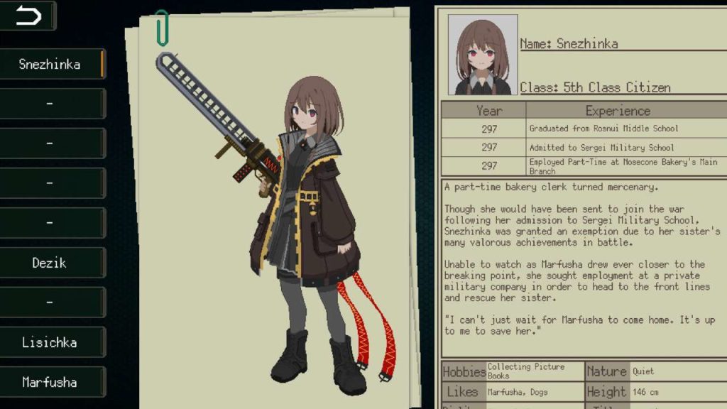 當 Snezhinka 與她的姐姐(一名精銳士兵)失去聯繫時,她加入了對抗敵對機甲的戰爭,以將她的姐姐帶回安全地帶。配給私人軍事公司發放的微薄工資,以進一步發展作戰能力。