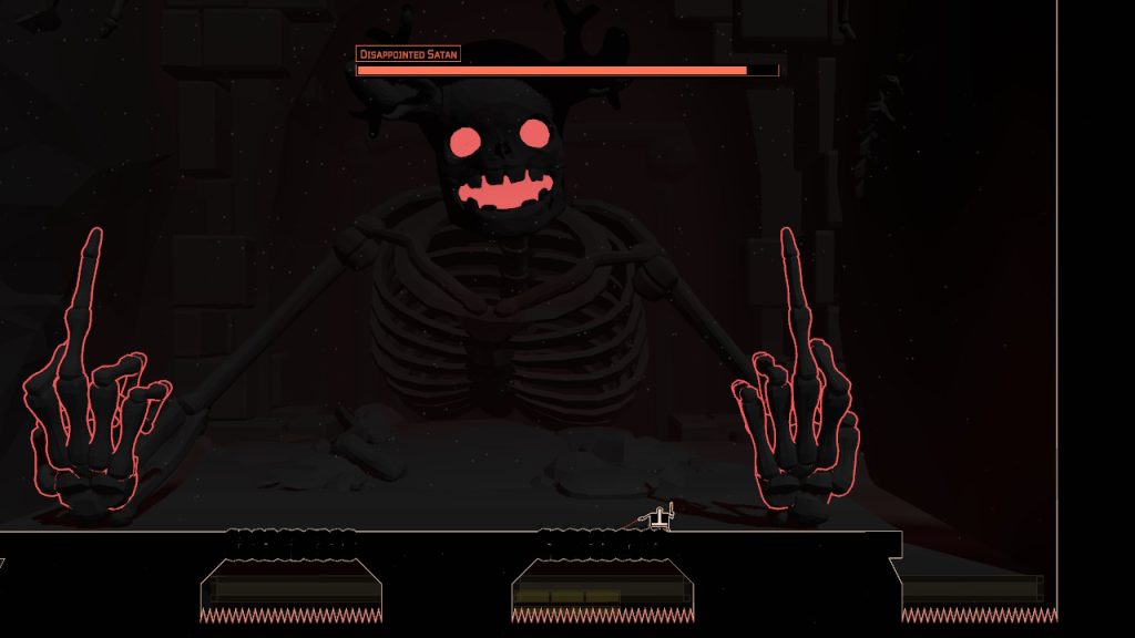 我想說《霰彈槍警察人》的畫面也是一個亮點,但這並不誠實。它們非常簡單,雖然本身並不難看,但它們比 DeadToast 的其他控制台版本中的風格要簡約得多。另外,還有很多空曠的黑色空間,有時會讓你在陷入陷阱和敵人之前很難看到它們。也就是說,我喜歡撒旦的形象,就像一些懶惰的 S&M 變態者。他懶得走路,而是被他的飛行爪牙帶著。在音樂上,遊戲也相當安靜,儘管英雄和他的敵人隨機單調的配音非常有趣。