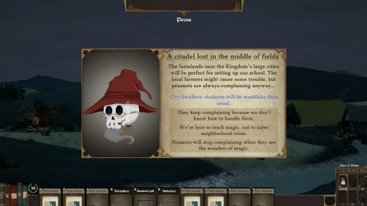 故事是通過事件和與各個派系的互動來傳達的:不贊成死靈術的審判官、只想找個地方聚會的獸人,以及可以賄賂以免燒毀學校的海盜。這裡有個性,我很欣賞創造力。但施法者大學相反,它會立即把所有元素放在你的桌子上——學生原型、派系間外交、數十種地位效應——並期望你跟上步伐。