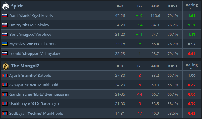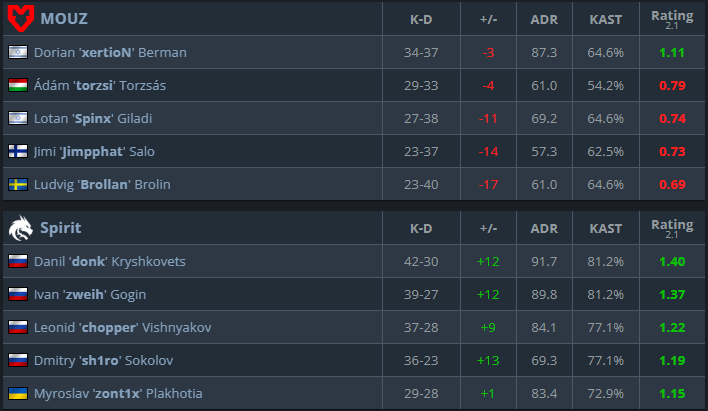 在半決賽對陣莫茲,每個人都在精神為了獲得勝利而瘋狂地比賽,沒有一個球員最終獲得接近負面的評價。這次不是二人組‘驢’和'sh1ro'領先記分牌;原來是‘驢’以及他們最近加入的年輕成員'二'作為團隊中第二好的表現者。他們狀態極佳,似乎已經準備好將第二座獎杯帶回家。