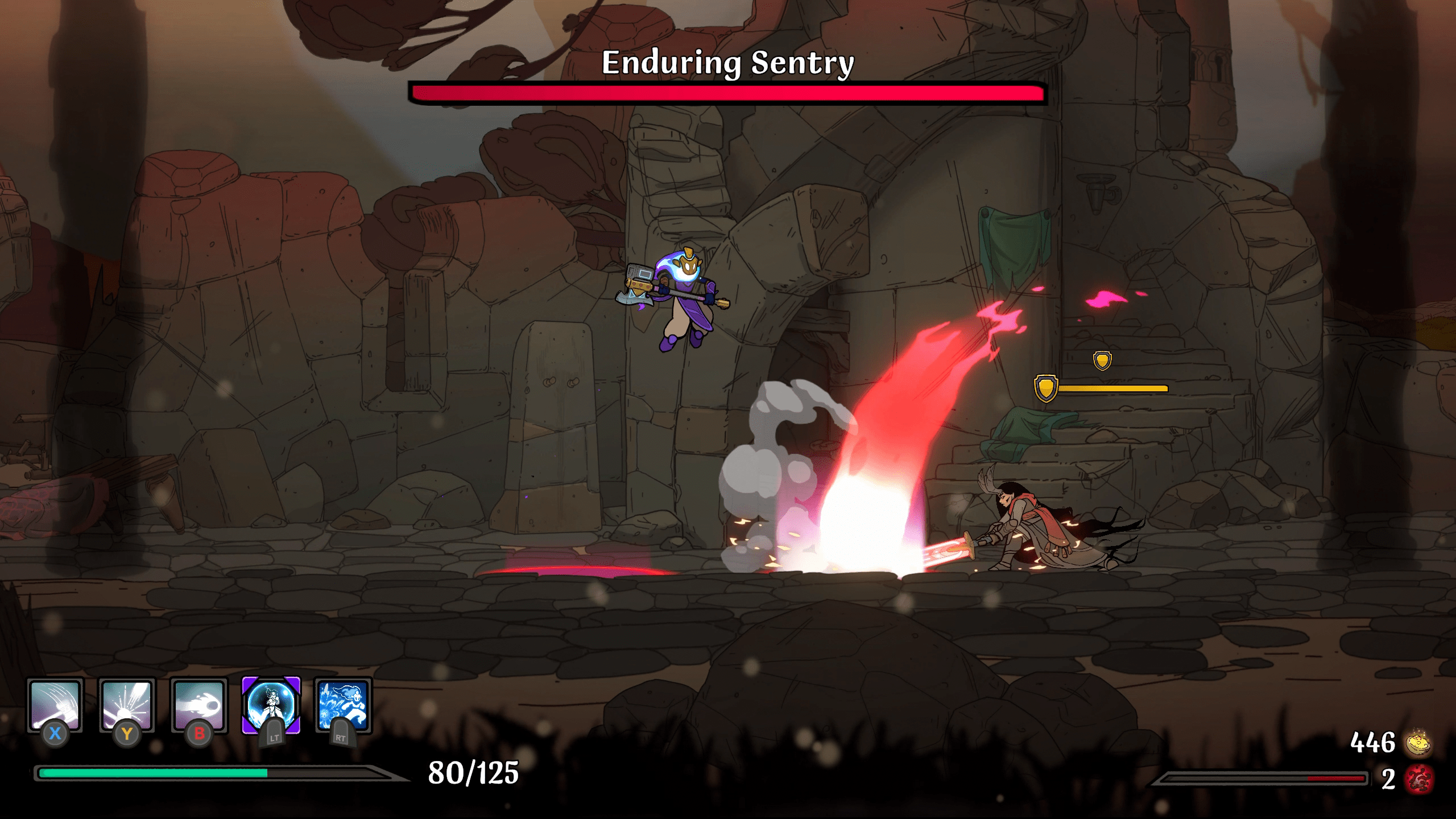 這個角色能夠在競技場上高速打乒乓球,而且我從來沒有感覺自己失去了控制,以至於我想說《Spiritfall》比我玩過的大多數平台戰士感覺都要好。