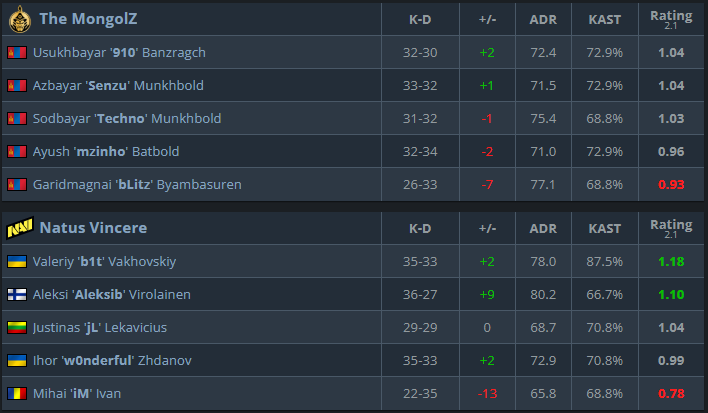 在遇到世界上最好的球隊之前,他們沒有丟失一張地圖活力,在這場比賽中,是'mzinhu',在比賽結束時唯一具有正評級的人。除了這場比賽,那是'910',,,,“閃電戰”和'sinzu'早些時候展示自己的良好表現,如果想進一步進入比賽,他們將不得不露面。以前,他們在季后賽階段比賽時以更糟糕的態度而聞名,但在最近的最大錦標賽中, 奧斯汀少校,他們在賠率上進入了總決賽。它們狀況良好,但是我們還沒有看到他們是否可以出現在季后賽階段。