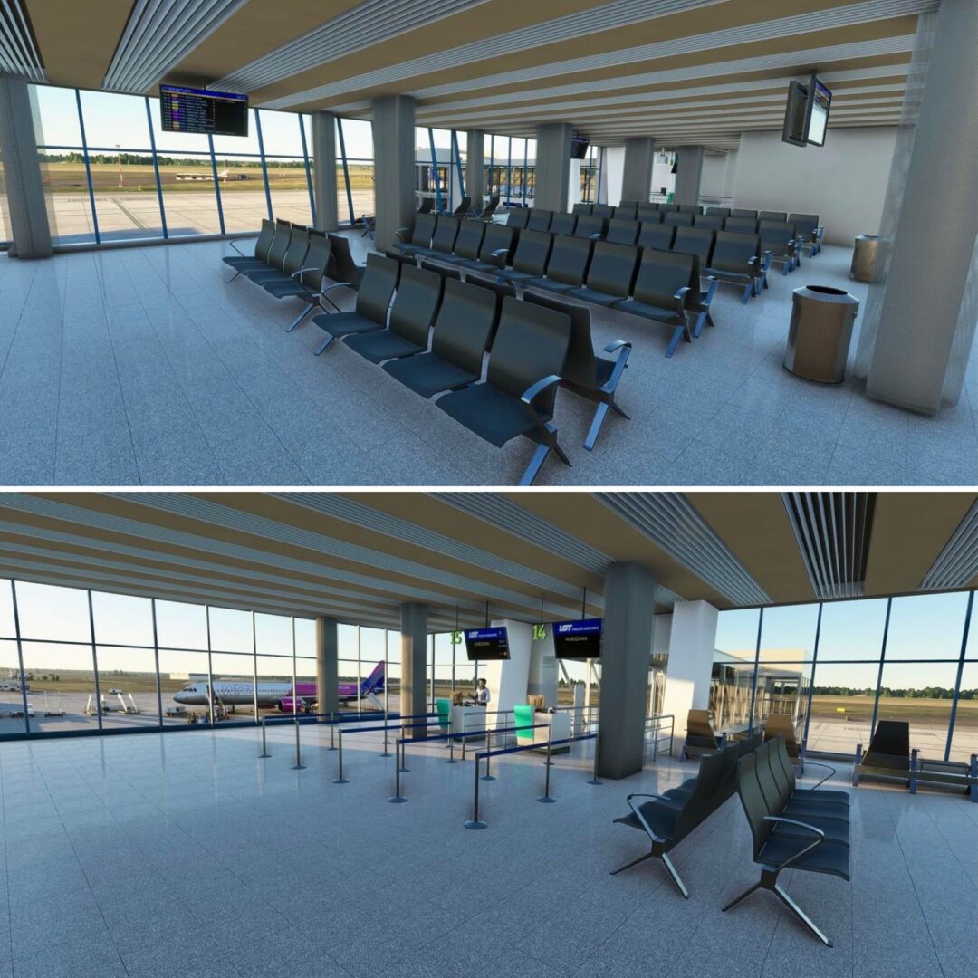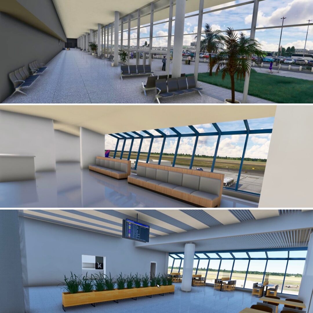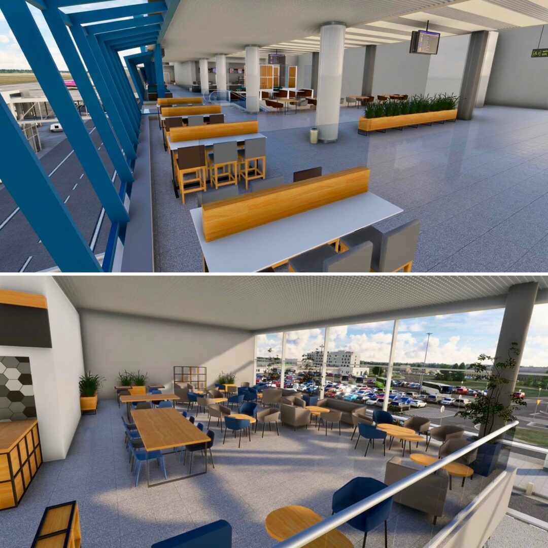 航站樓內,新的登機口、休息區、咖啡館和等候區以及定制的家具、植物和室內裝飾均已完工。每個元素——從長凳和桌子到垃圾桶和標牌——都是手工製作和放置的,以匹配現實世界的佈局。二樓的咖啡廳現在配備了新的家具和花盆,為旅客和遊客營造了獨特的氛圍。