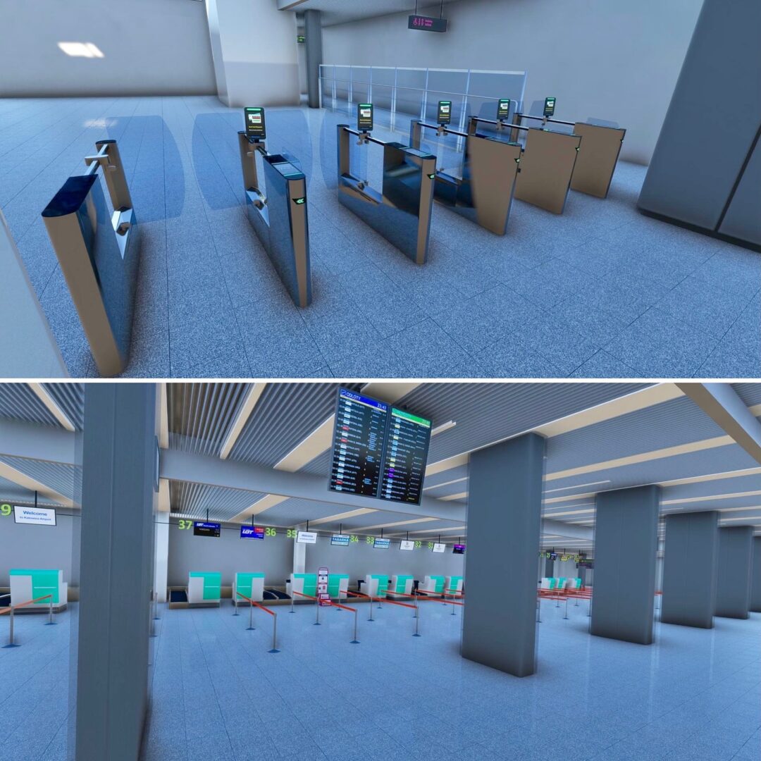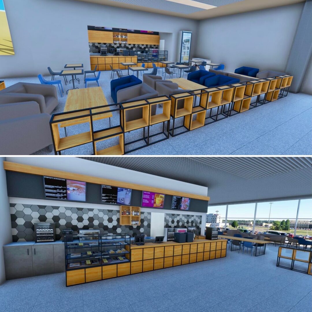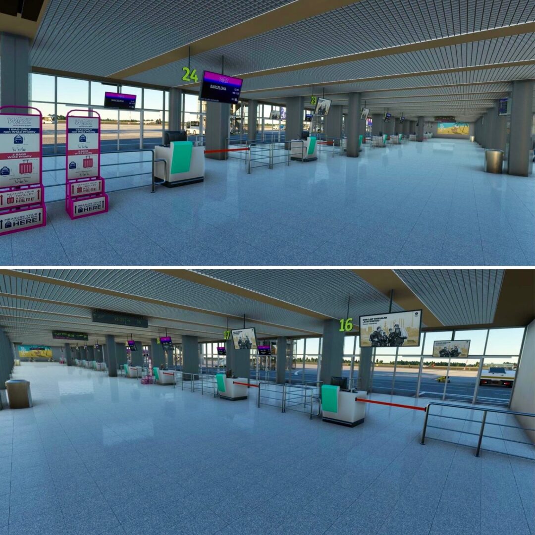 航站樓內,新的登機口、休息區、咖啡館和等候區以及定制的家具、植物和室內裝飾均已完工。每個元素——從長凳和桌子到垃圾桶和標牌——都是手工製作和放置的,以匹配現實世界的佈局。二樓的咖啡廳現在配備了新的家具和花盆,為旅客和遊客營造了獨特的氛圍。