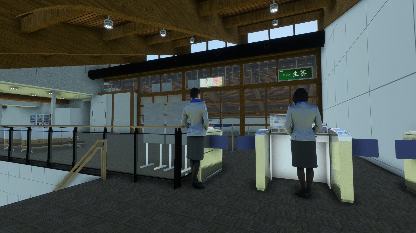 Gate15 Scenery 提供了另一張即將推出的屏幕截圖庫根室中標津機場(RJCN),日本北海道,展示穿著制服的日航和全日空登機口工作人員。